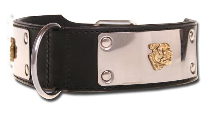 Hondenhalsband Dogs of Steel, Deze zwarte hondenhalsband is gemaakt van dubbellaags leer. De versiering op de halsband is opvallend: aan beide zijden een hondenkop op een roestvrijstalen plaatje. Er is ook een bijpassende hondenriem. Bepaal de juiste maat voor uw hond: meten is weten Leverbaar in de volgende maten: Maat Nekomvang Breedte XS 40 – 43,5 cm 40 mm S 44 – 48,0 cm 40 mm M 48 – 52,5 cm 40 mm L 44 – 48,0 cm 60 mm XL 48 – 52,5 cm 60 mm XXL 53 – 58,0 cm 60 mm XXXL 58 – 62,0 cm 60 mm